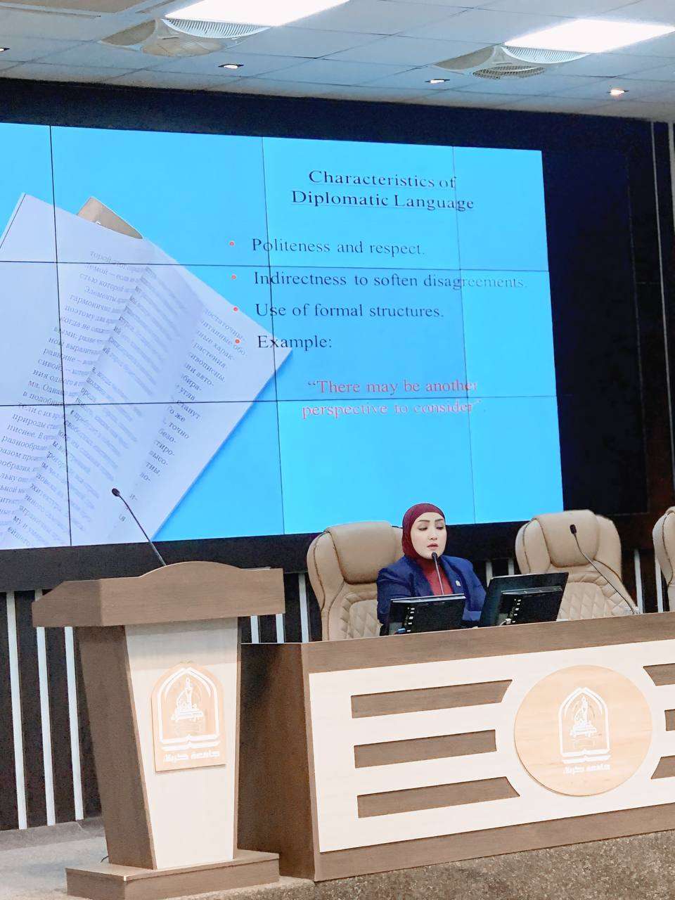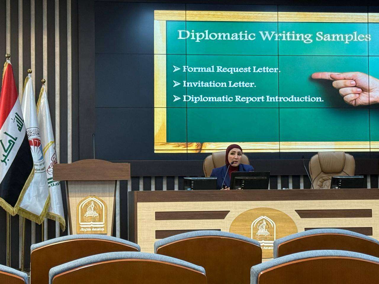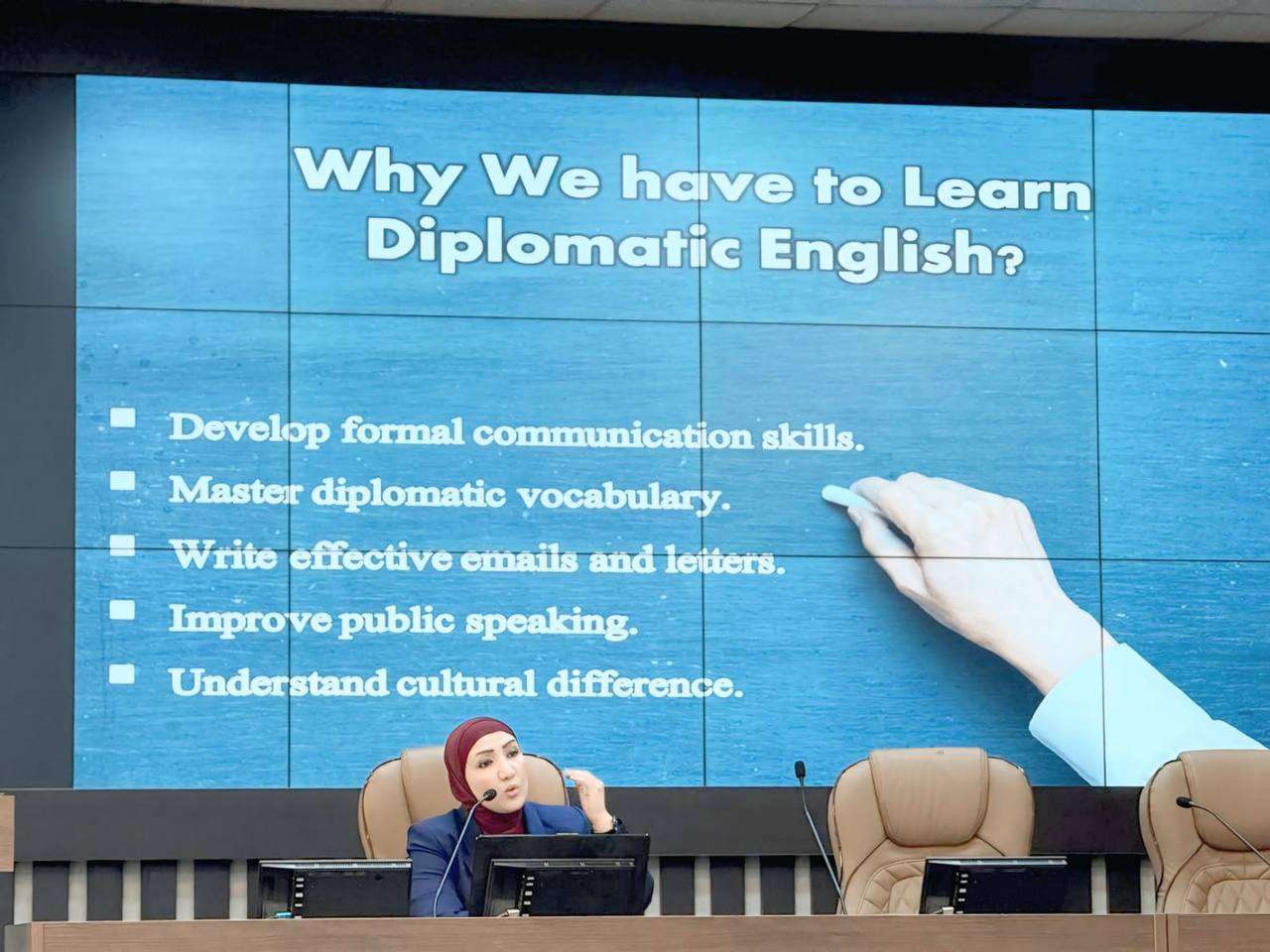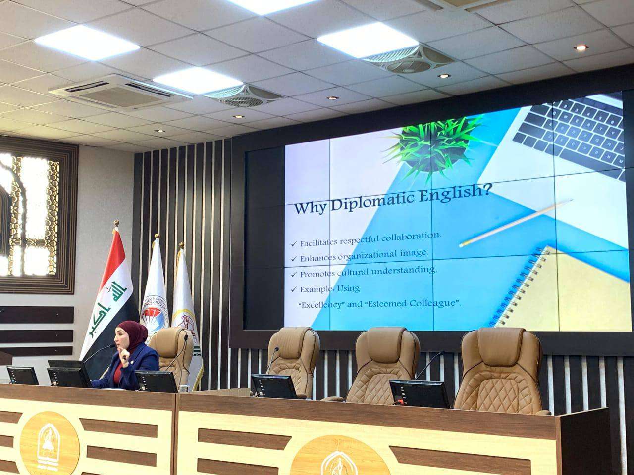 قدمتها السيدة مدير قسم البعثات و العلاقات الثقافية (م. د. حوراء جبار راهي) ، بهدف تعزيز مهاراتهم في كتابة الرسائل والإيميلات الرسمية باللغة الإنكليزية بطريقة دبلوماسية احترافية وتعزيز المهارات اللغوية والثقافية اللازمة للنجاح في بيئة دولية متغيرة.