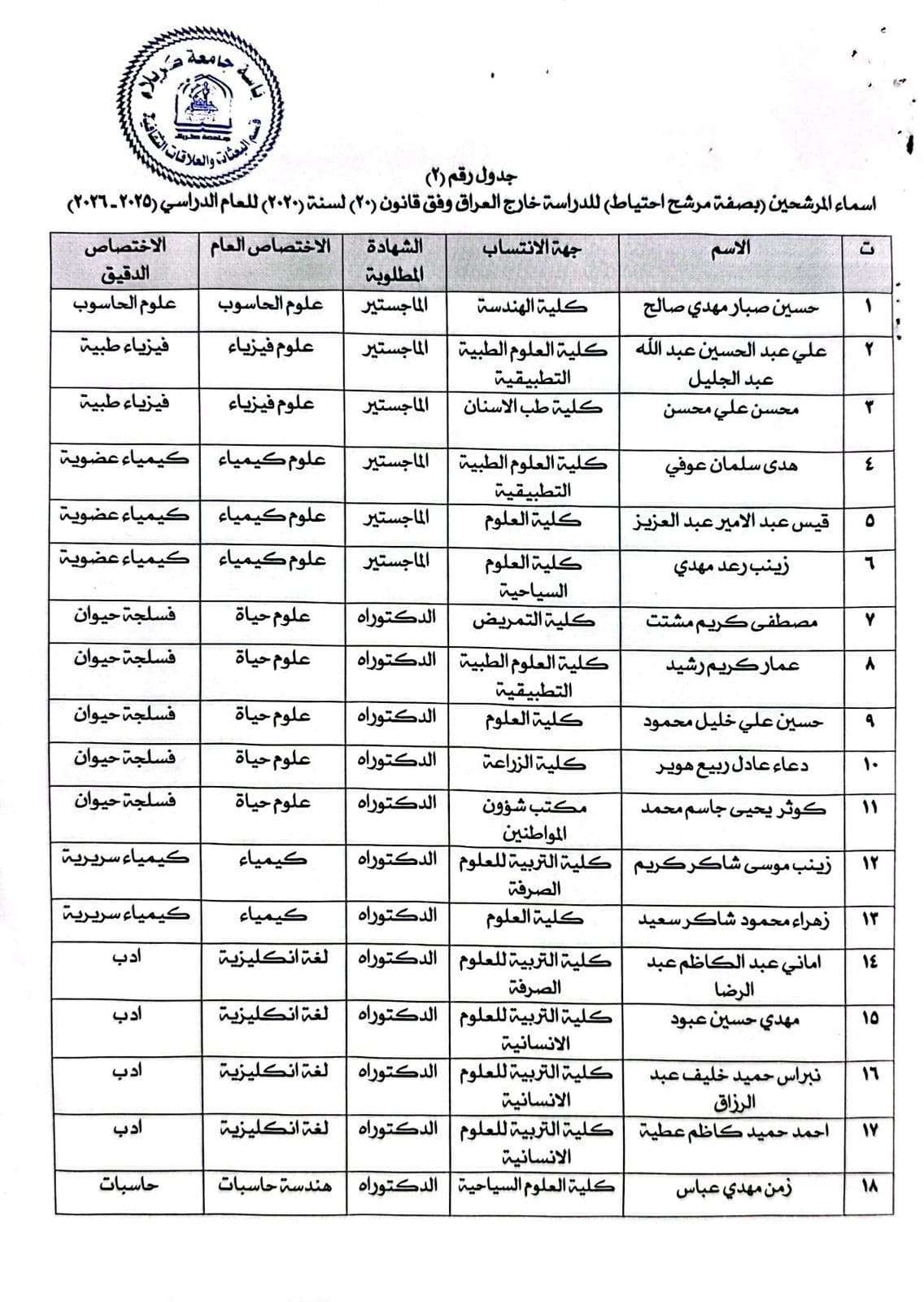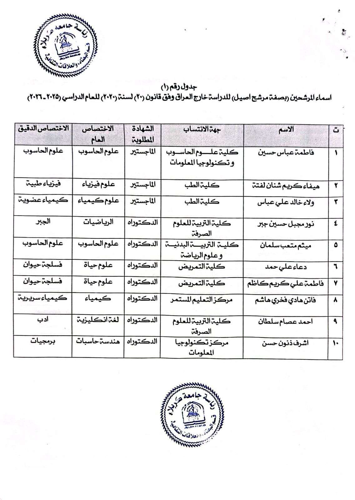 في ادناه ⬇️ الأمر الجامعي للدراسة خارج العراق وفق قانون 20 لسنة 2020 للعام الدراسي 2026 – 2025 للحصول على شهادة (الماجستير – الدكتوراه) للمرشحين المذكورة تفاصيلهم بصفة مرشح (اصيل و احتياط) للتفضل في اعمامه على منتسبيكم لغرض استكمال اجراءات فتح الملف الدراسي علماً ان آخر موعد للتقديم على المنظومة الخاصة بفتح الملف الدراسة بتاريخ 2025/12/31 …مع التقدير.