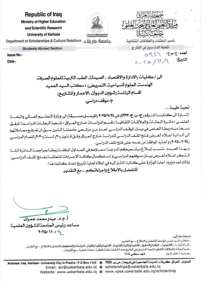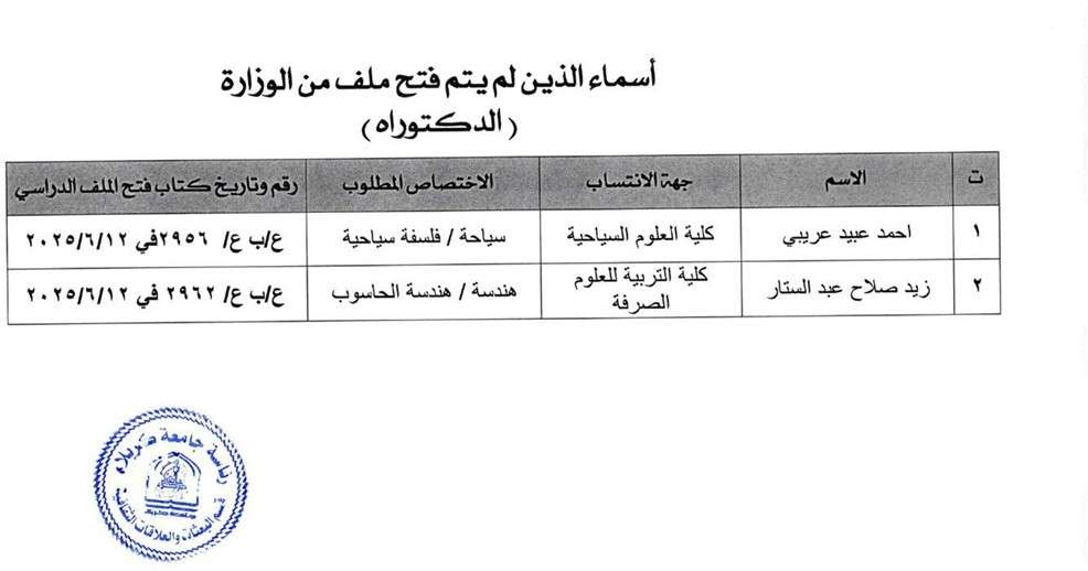 في ادناه اسماء المرشحين وفق قانون 20 لسنة 2020 للعام الدراسي (2024 – 2025) الذين سبق ان تم رفع معاملاتهم الى الوزارة لغرض فتح الملف الدراسي وعليه تنسب مراجعتهم الى الوزارة لغرض بيان موقفهم الدراسي واستكمال اجراءات فتح الملف الدراسي.